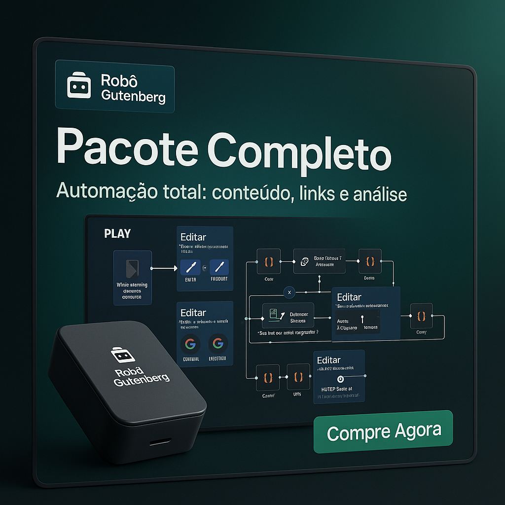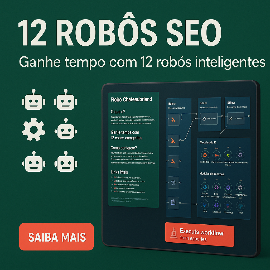 Chega de gastar horas em tarefas manuais de SEO. Com o Pacote SEO, você leva 12 robôs inteligentes que automatizam desde a análise técnica até a criação de conteúdo e link building.