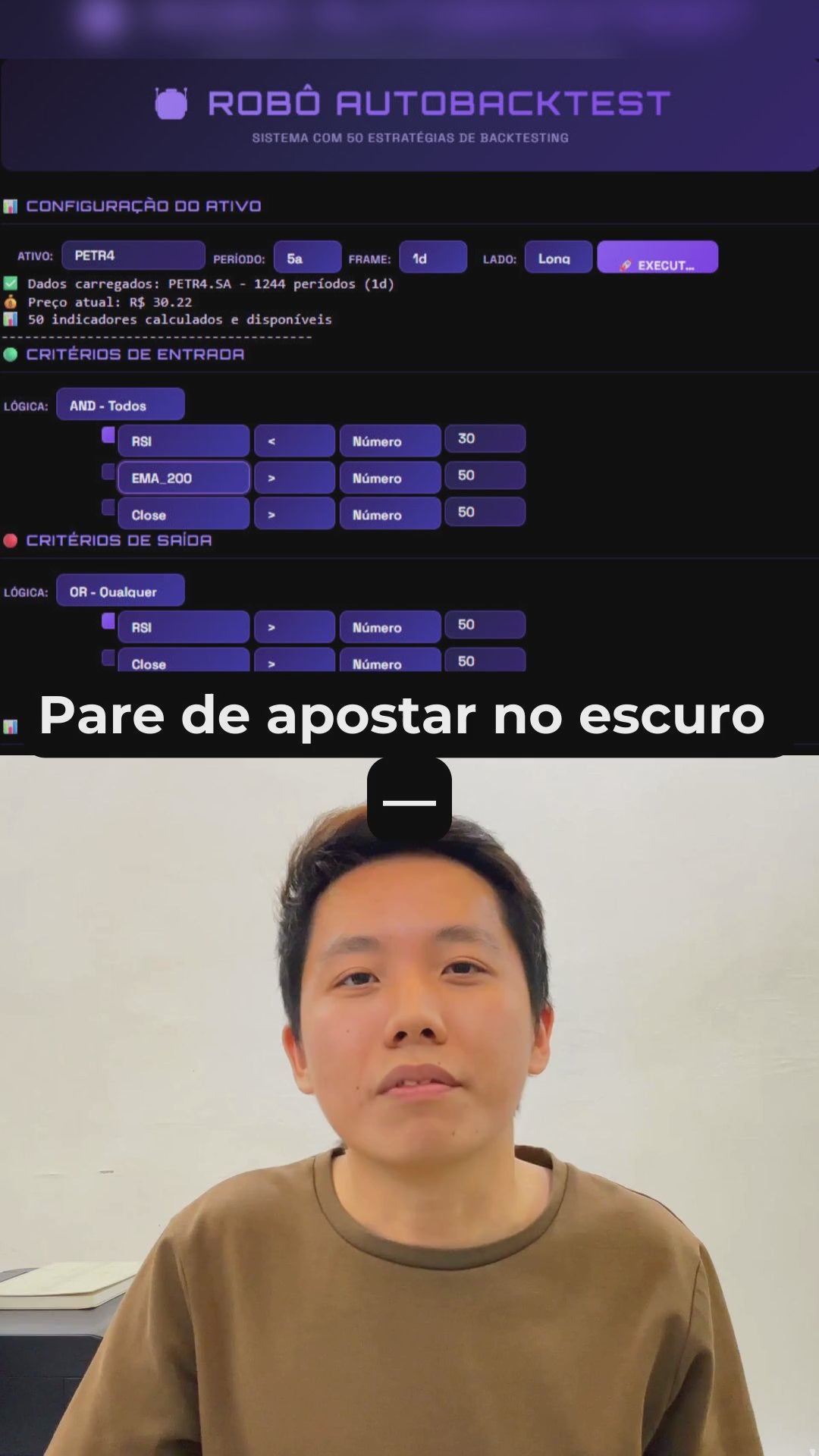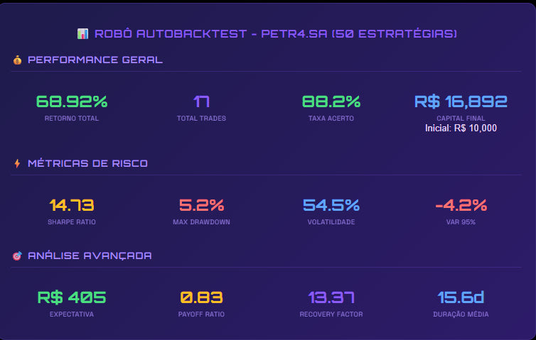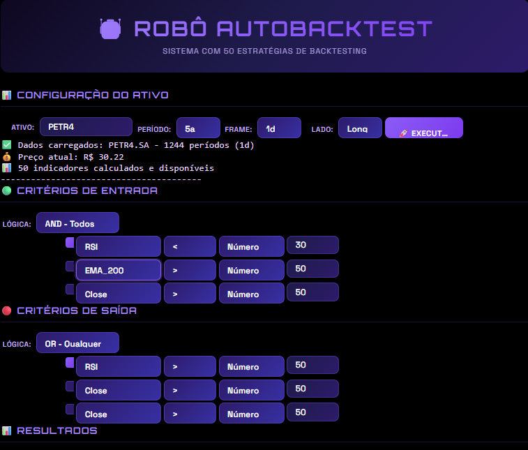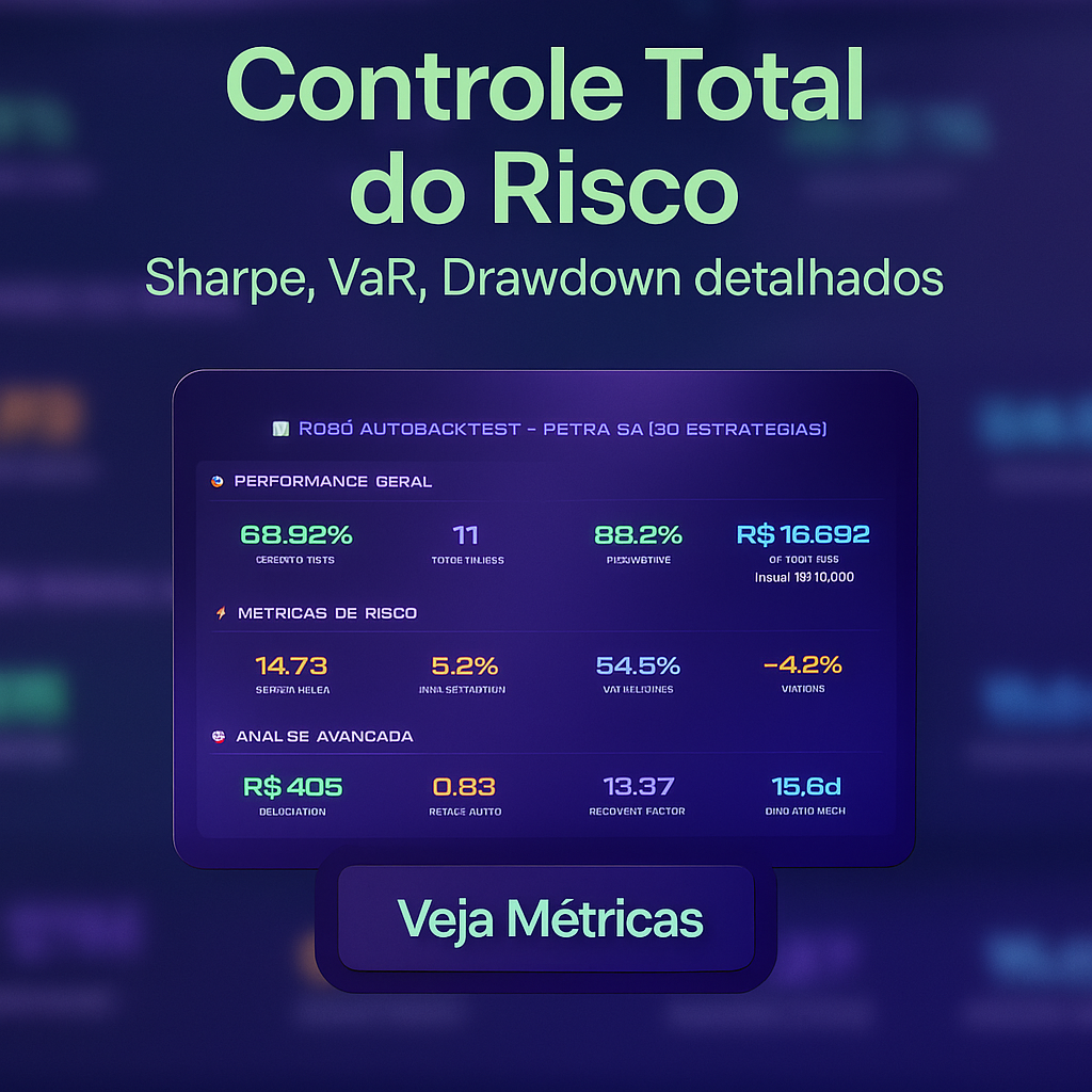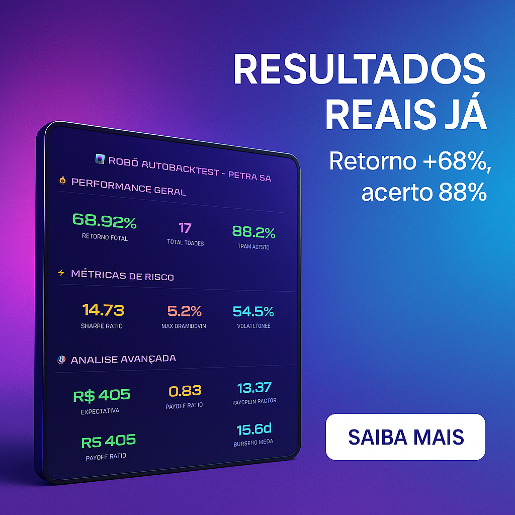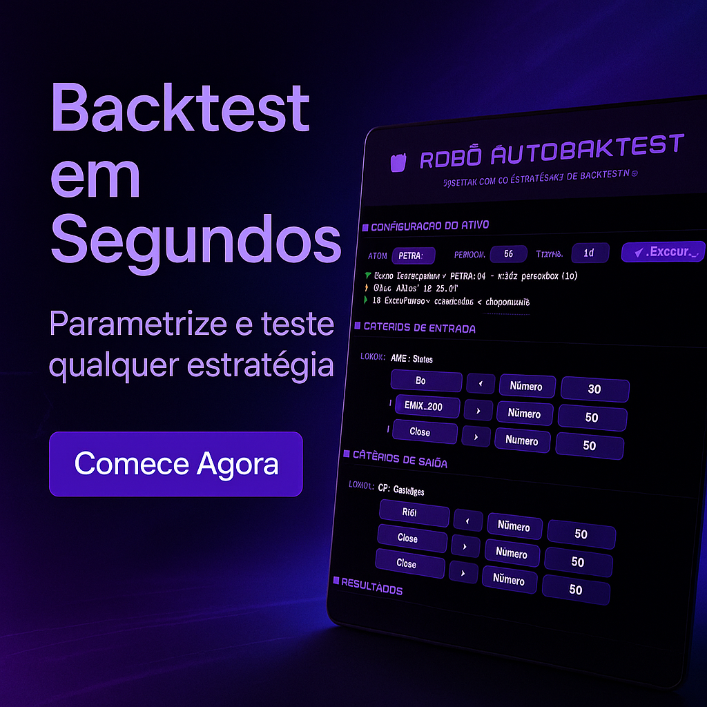 O Robô AutoBacktest é uma ferramenta de apoio educacional e de pesquisa quantitativa. Ele não constitui recomendação de compra ou venda de ativos financeiros. Os backtests apresentados refletem apenas o desempenho histórico e simulado das estratégias configuradas, podendo divergir totalmente da realidade futura.
