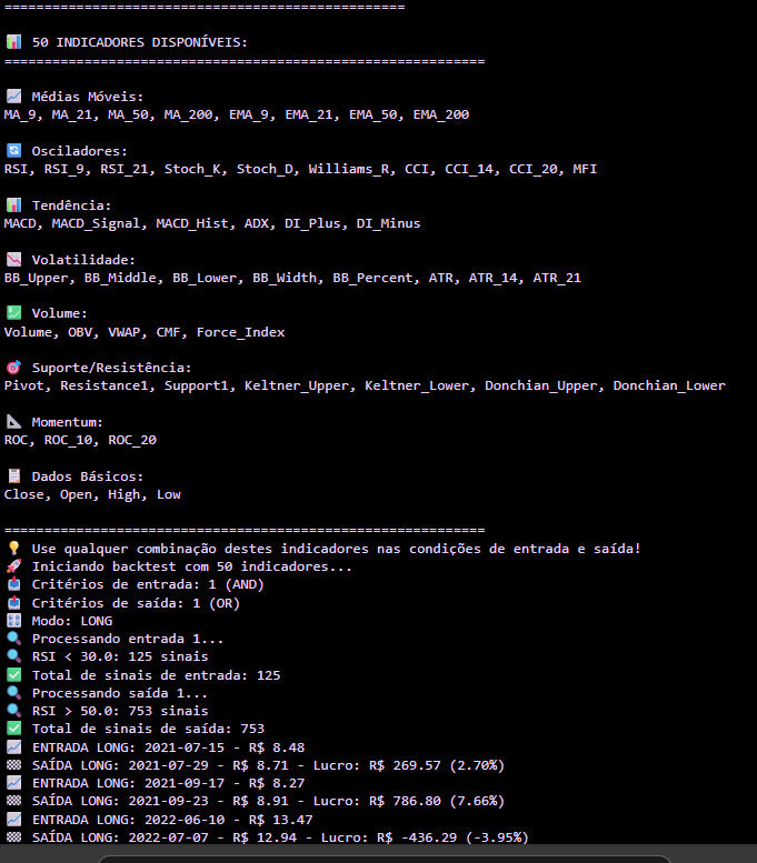 2️⃣ Defina regras de entrada/saída usando qualquer dos 50 indicadores.