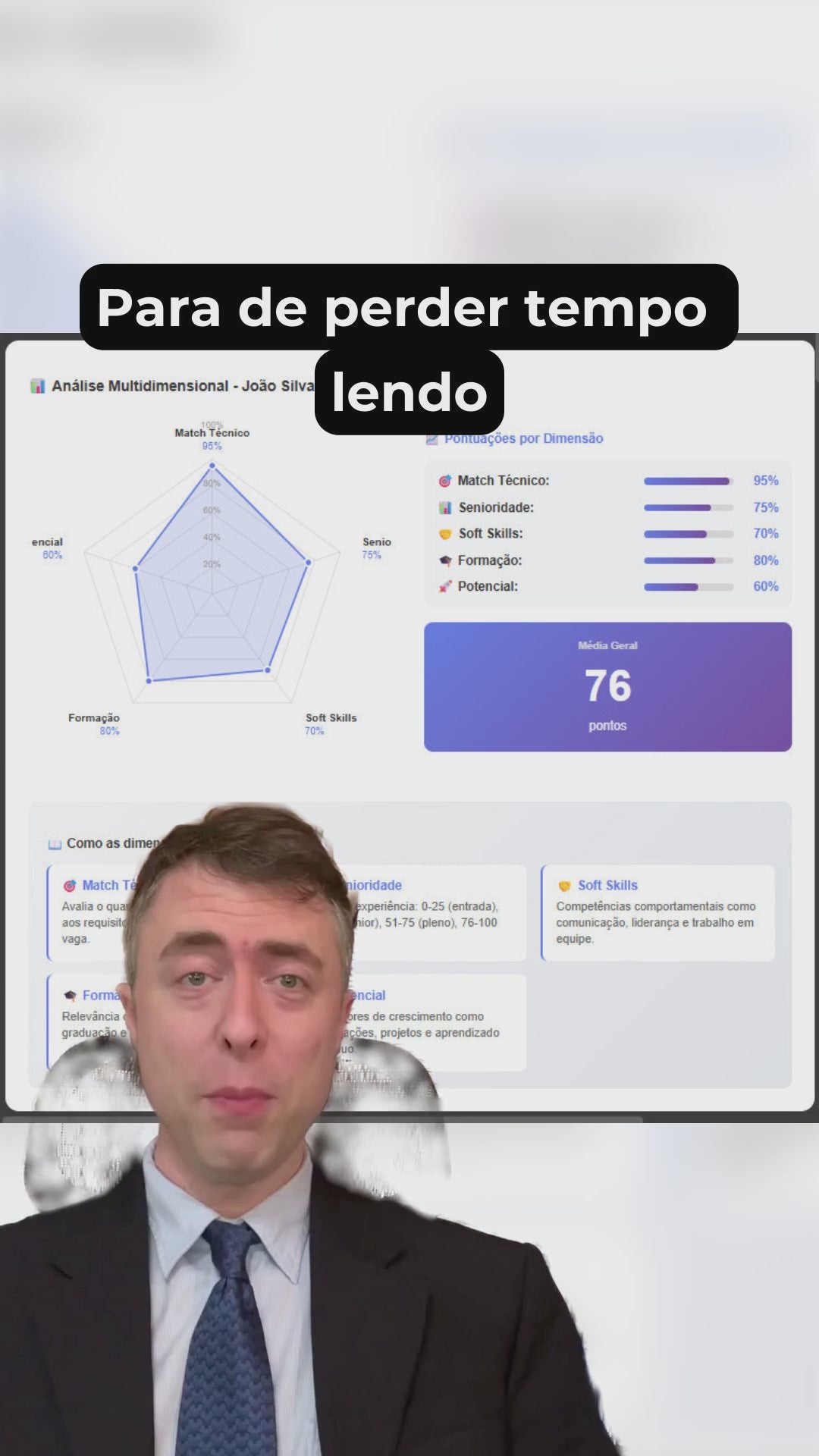 ✅ Avaliação multidimensional (Match Técnico, Senioridade, Soft Skills, Formação, Potencial).
