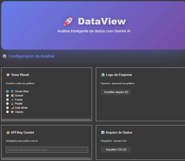 🎨 Permite escolher temas visuais modernos para seus gráficos (Ocean Blue, Sunset, Dark Mode e mais).