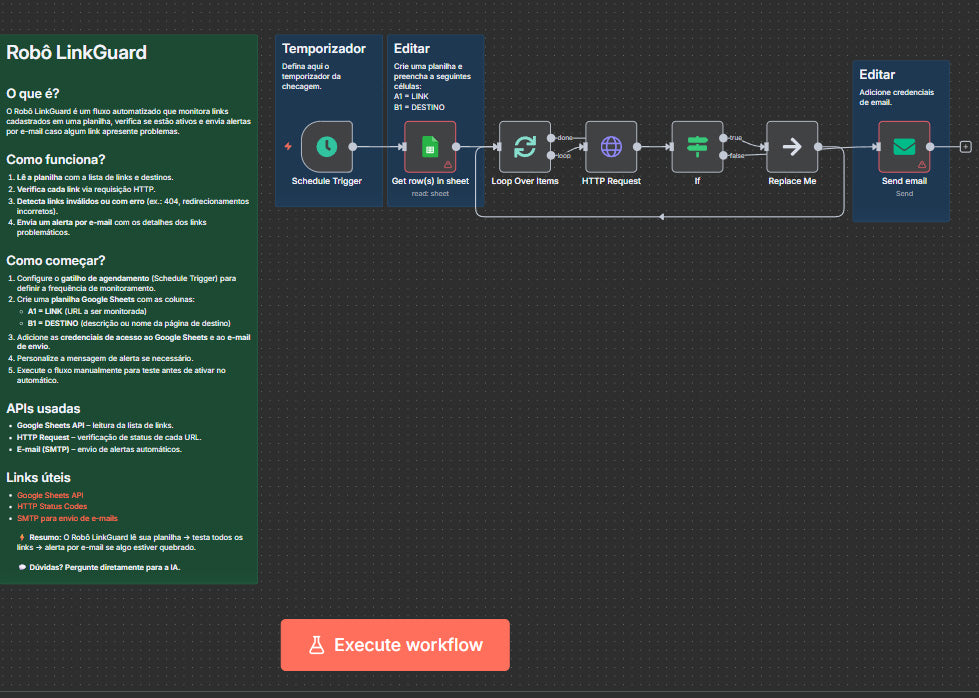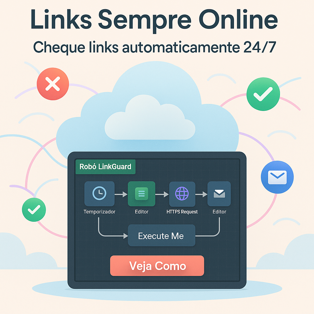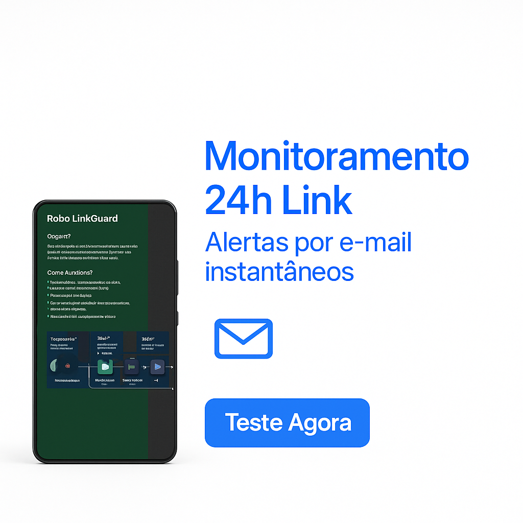 Proteja seus backlinks no piloto automático com o Robô LinkGuard: ele lê sua planilha, verifica se cada página ainda contém o destino esperado e dispara alertas por e-mail quando um link some – simples, direto e 100% autônomo.