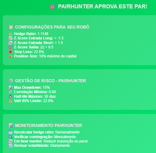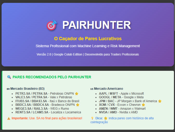 O PairHunter é uma ferramenta educacional e de apoio à análise quantitativa. Ele não constitui recomendação de investimento, compra ou venda de ativos financeiros. Os resultados gerados (scores, relatórios e sinais) são baseados em modelos estatísticos e de machine learning sujeitos a incertezas, limitações de dados e condições de mercado que podem mudar rapidamente.