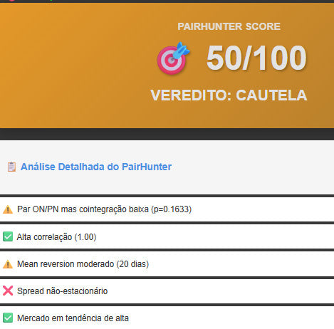 Chega de perder tempo testando pares manualmente. O PairHunter analisa automaticamente dois ativos e diz se vale a pena operar long & short, entregando um score objetivo (0 a 100) com base em cointegração, correlação, risco e sinais de Machine Learning.