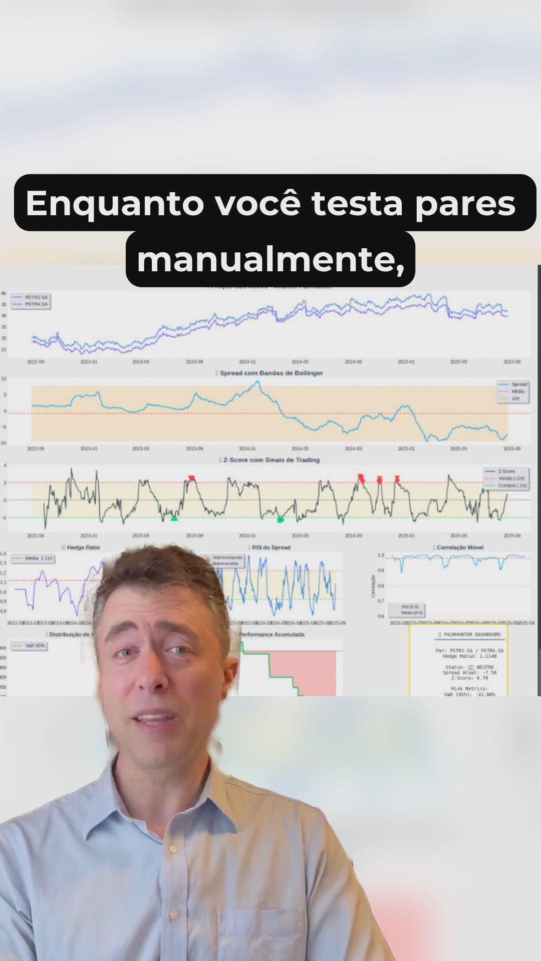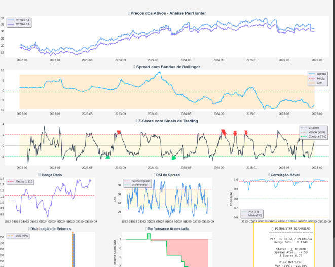 📊 Painel completo de métricas (VaR, CVaR, half-life, correlação).