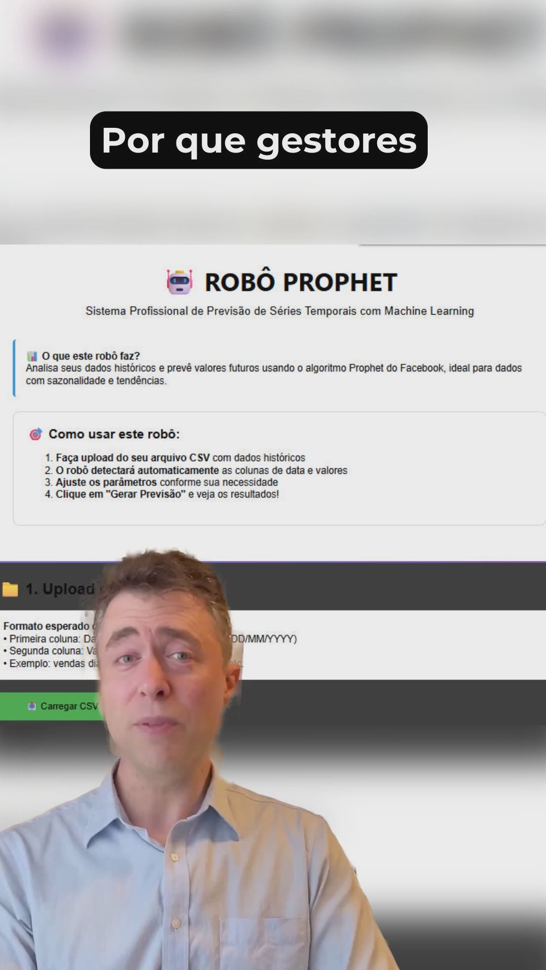 Pare de voar no escuro com planilhas e chutes — este robô transforma qualquer CSV em previsões visuais de 7 a 365 dias usando o mesmo algoritmo que o Facebook usa internamente, sem código e em minutos.