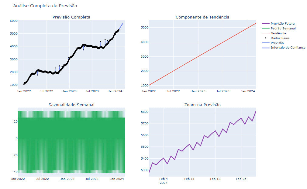 🖥️ Dashboard interativo (Plotly): Previsão completa, tendência, padrão semanal e zoom no futuro em gráficos limpos e navegáveis.