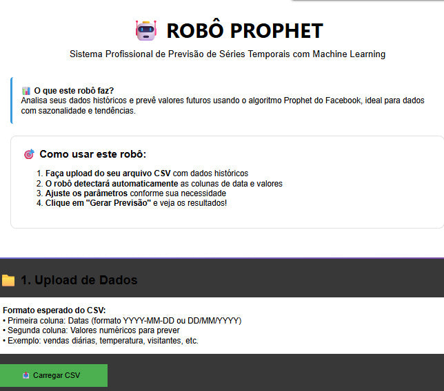 O Robô Prophet é um sistema de previsão “no-code-like” feito em python para Google Colab que transforma qualquer CSV (data + valor) em projeções claras. Ele usa o algoritmo Prophet (tendência + sazonalidade + feriados) e oferece controles visuais (sliders e checkboxes) para ajustar confiança, tipo de tendência (linear/logistic), sazonalidades (diária/semanal/anual) e sensibilidade a mudanças (changepoints). Resultado: previsões confiáveis, prontas para apresentação.