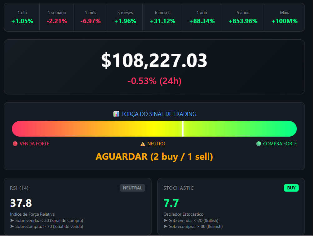 📊 Barra de Força do Sinal: consolida BUY/SELL dos principais indicadores (RSI, Stoch, MACD, BB, MFI) em um único termômetro.