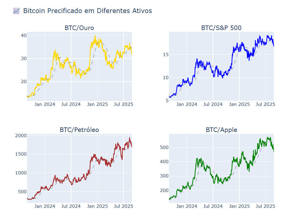 🪙 BTC como Unidade: quanto de cada ativo 1 BTC compra (ouro, S&P, petróleo, ETH).