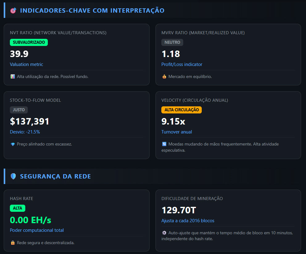 🧠 Valuation On-chain: NVT & MVRV mostram se o preço está caro, barato ou neutro vs uso real da rede.