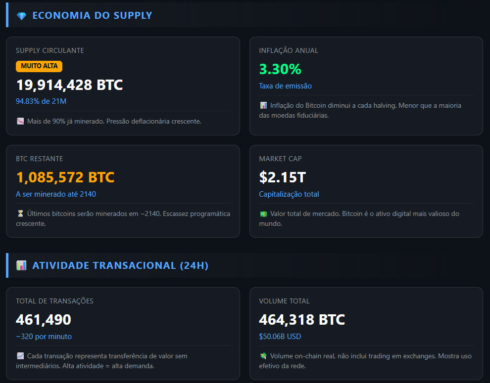 🛡️ Segurança da Rede: Hashrate, dificuldade e nós ativos — quão blindada está a rede.