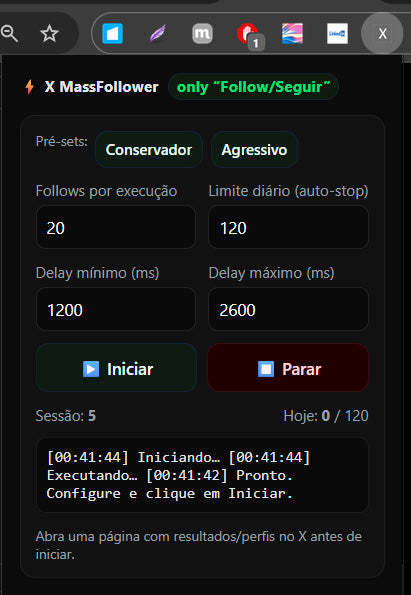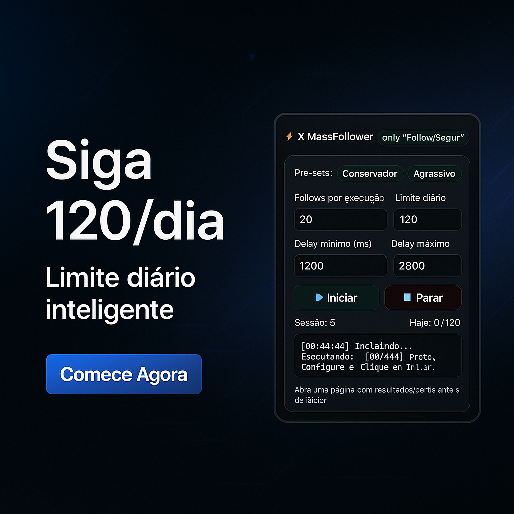 Chega de gastar horas clicando em Follow. Com o X MassFollower, você ativa o piloto automático para conquistar seguidores e ampliar sua presença no X sem esforço.